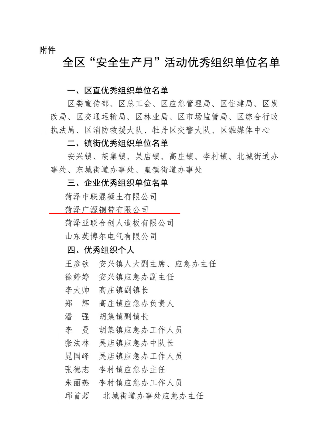 菏澤廣源銅帶有限公司獲評牡丹區(qū)“安全生產(chǎn)月”活動優(yōu)秀組織單位