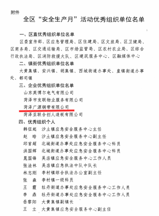 喜報(bào):菏澤廣源銅帶有限公司榮獲牡丹區(qū)"安全生產(chǎn)月"活動(dòng)優(yōu)秀組織單位稱號(hào)