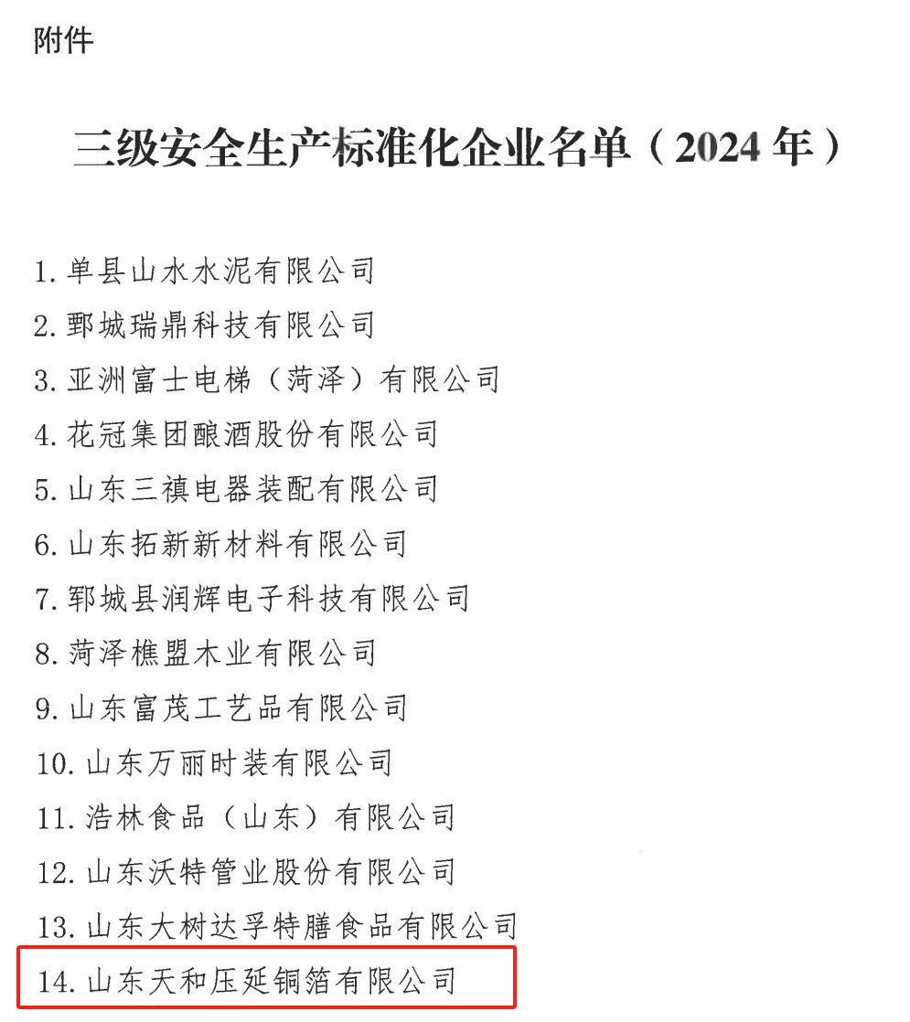 喜訊:山東天和壓延銅箔有限公司被評(píng)定為三級(jí)安全生產(chǎn)標(biāo)準(zhǔn)化企業(yè)