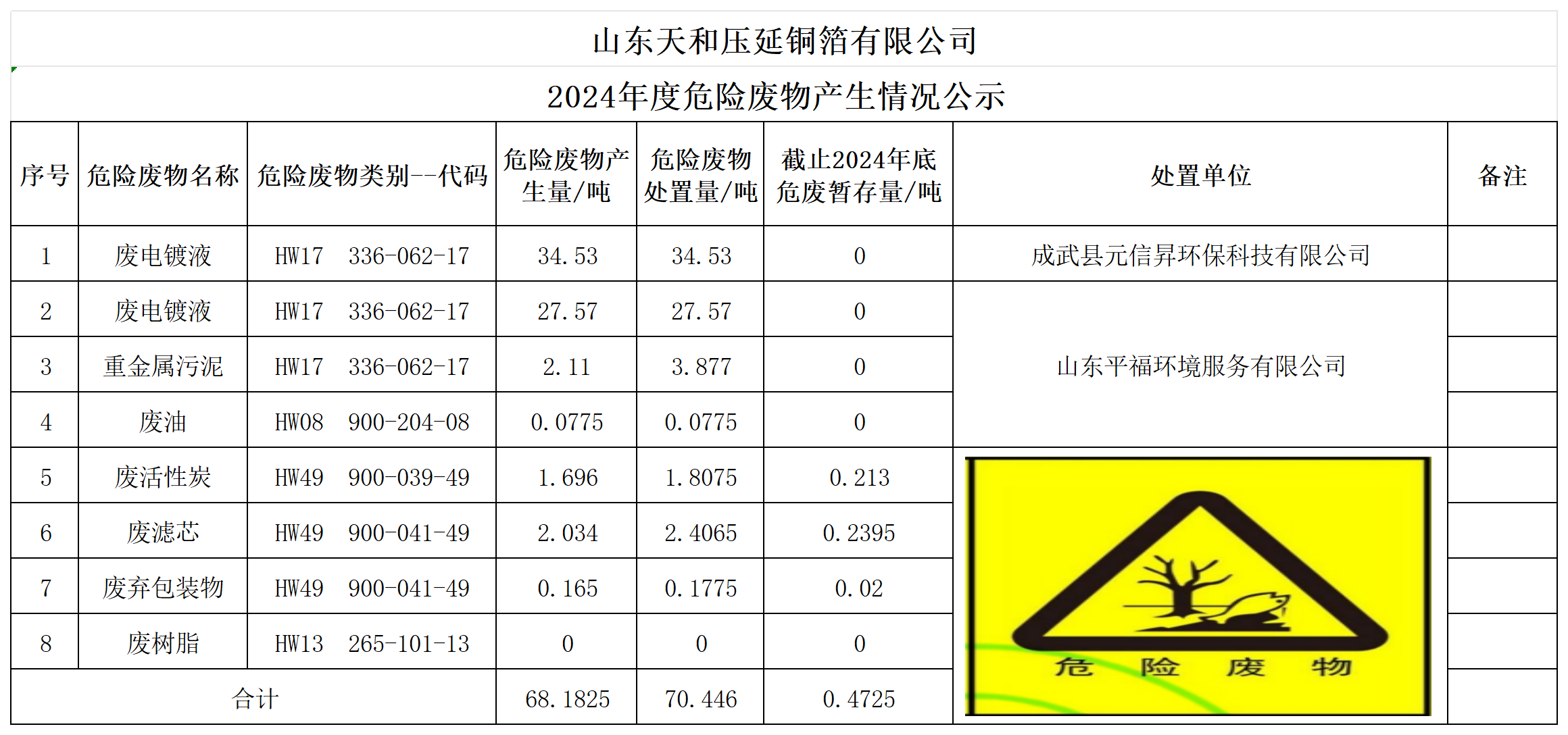 山東天和壓延銅箔有限公司2024年度危險(xiǎn)廢物產(chǎn)生情況公示