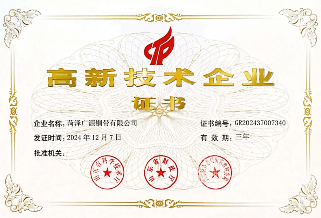 喜報!菏澤廣源銅帶有限公司再獲高新技術企業(yè)認定
