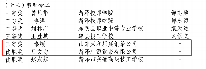 近日,菏澤市首屆職業(yè)技能大賽獲獎名單公布,天和銅業(yè)權屬企業(yè)兩名員工表現亮眼:山東天和壓延銅箔有限公司的秦順獲裝配鉗工賽項三等獎,菏澤廣源銅帶有限公司的呂文力獲該賽項優(yōu)勝獎,二人成為本屆賽事中引人注目的企業(yè)工匠代表。