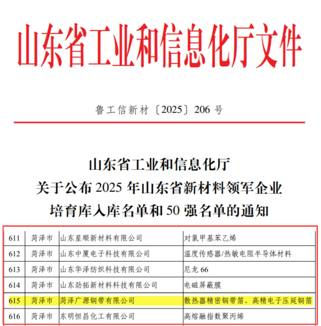 喜報!菏澤城投控股集團權(quán)屬企業(yè)菏澤廣源銅帶入選省級新材料領(lǐng)軍企業(yè)培育庫